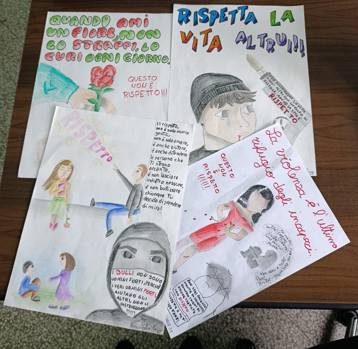 Un ruolo centrale è stato affidato alla produzione creativa: gli alunni hanno realizzato disegni, cartelloni ed elaborati grafici e testuali per rappresentare i valori della non violenza, dell’inclusione e della convivenza positiva. I lavori, diversi per stile e linguaggio a seconda dell’età, hanno espresso con sensibilità e originalità il significato del rispetto nelle relazioni scolastiche e sociali.